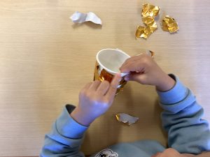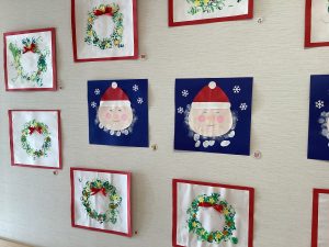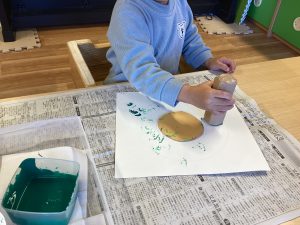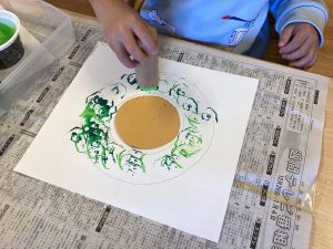0・1歳児さんはシールを 2歳児さんはおりがみを貼って