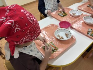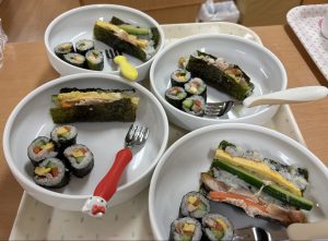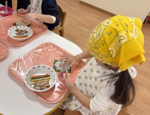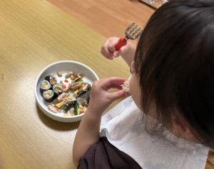 具材たっぷりの海苔巻きを巻くのはとても大変でしたが、完成した巻き寿司を「のりまきサイコー🎵」と言いながら美味しそうに頬張っていました^ ^